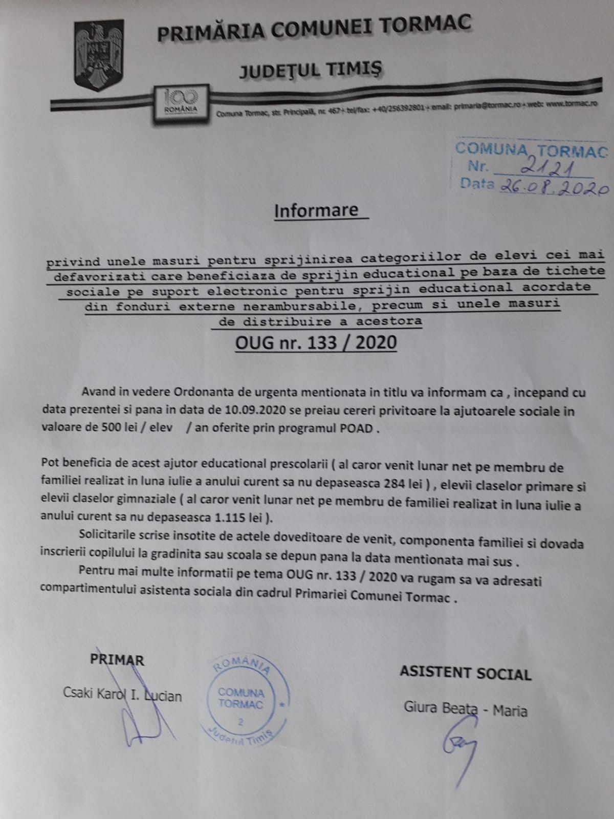 Începând cu data 03.09.2020, primăria orașului aleșd, prin direcția de asistență socială, demarează acțiunea de primire a solicitărilor pentru acordarea tichetelor sociale pe suport electronic pentru sprijin educaţional, în conformitate cu o.u.g.. 133 din 7 august 2020 privind unele măsuri pentru sprijinirea categoriilor de elevi cei mai defavorizați care beneficiază de sprijin educațional pe bază de tichete sociale pe suport electronic pentru sprijin educațional acordate din fonduri externe. Detalii scris de primaria alesd. 126/2002, se acordă rechizite școlare elevilor din învățământul de stat, primar și gimnazial, cursuri de zi, care sunt în întreținerea familiilor al căror venit mediu lunar. 26.08.2020 · model cerere pentru acordarea tichetelor sociale în sprijin educațional conform oug 133/2020... 133 din 2020 a intrat in vigoare si se aplica deja.